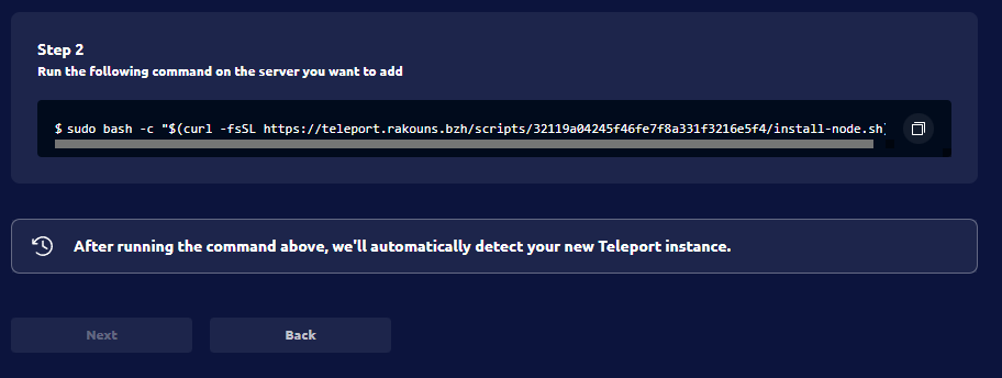 Une fois la commande lancée sur le serveur cible, "Next" se colore en violet, et l'installation est terminée !