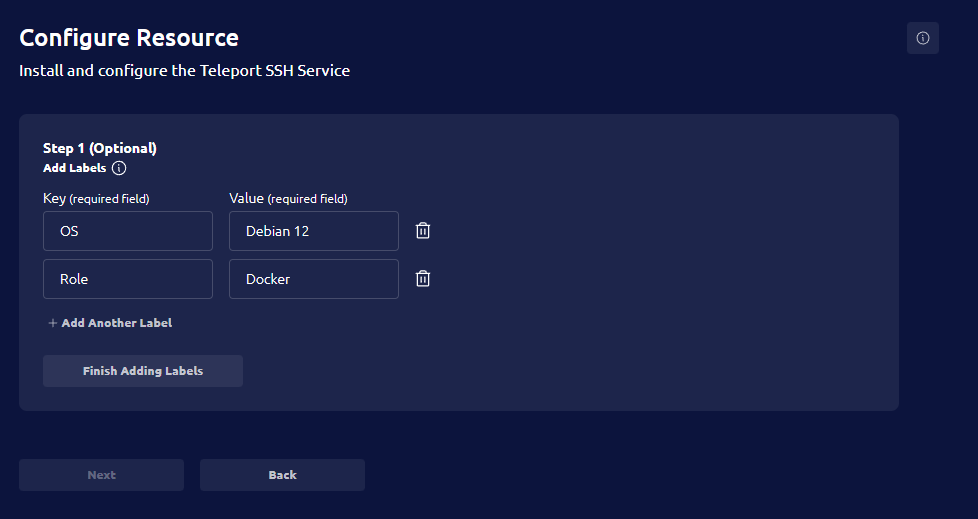 On ajoute les eventiel labels que l'on voudrait mettre, puis on clique sur "Finish Adding Labels", ce qui nous donne alors une ligne de commande, qui installera et lancera le client teleport :
